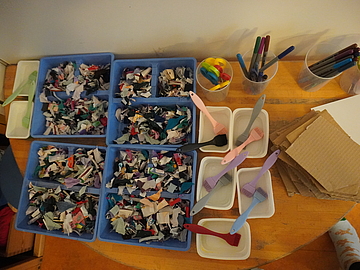 Kinder entdecken Stoffe, Wolle und Farben. Sie gestalten kreativ, bauen Räume und verbinden Materialien auf vielfältige Weise.